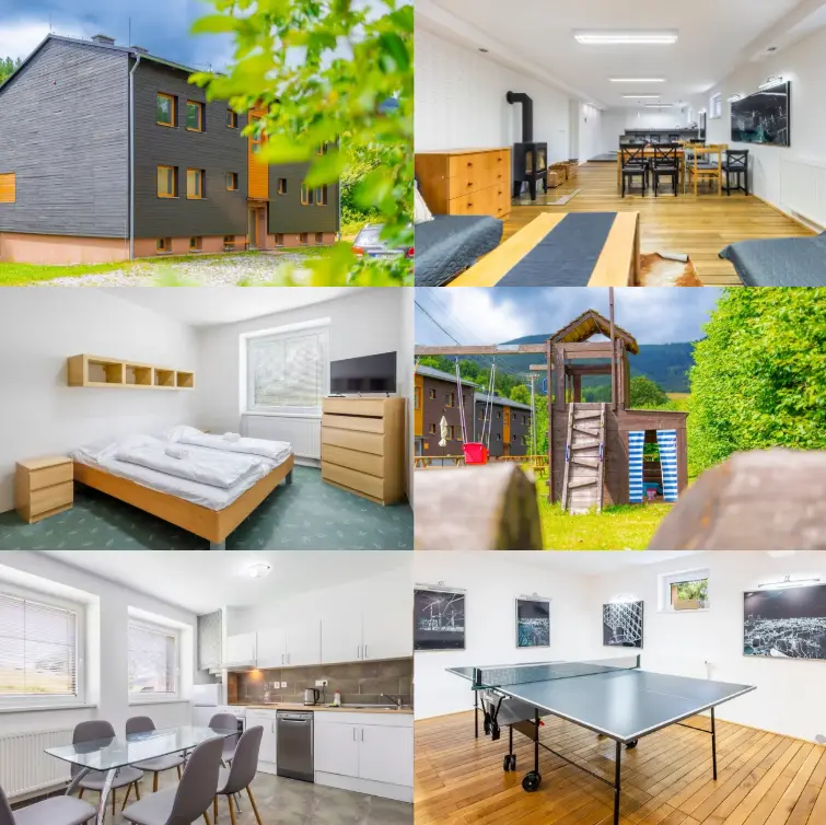 Naše apartmány se nachází v úžasné části Jeseníků, přímo pod Králickým Sněžníkem, jen pár kroků od lanovky a známého skiareálu Kraličák. Nabízíme prostorné ubytování pro 32 osob ve čtyřech samostatných apartmánech 3+kk s kapacitou 8 osob. Každý apartmán má plně vybavenou kuchyni s obývacím prostorem, vlastní sociální zařízení a dvě samostatné ložnice. Společné chvíle si užijete ve společenské místnosti s krbem a ping-pongem nebo na rozlehlé zahradě s hřištěm a ohništěm.